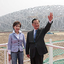 圖:連戰夫婦參觀建設中的“鳥巢”(4月29日14:57)