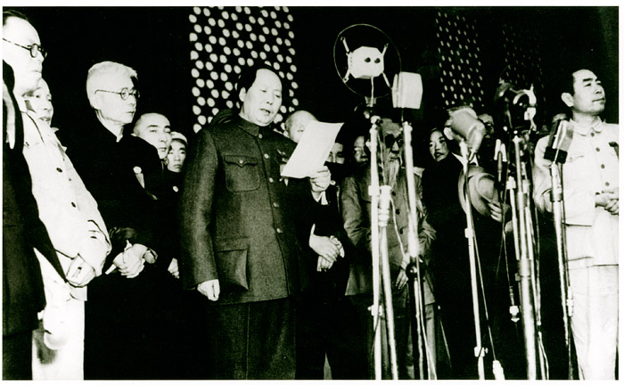 下午3時,首都30萬軍民齊聚天安門廣場,舉行開國大典。毛澤東宣讀了《中華人民共和國中央人民政府公告》,升起了莊嚴的國旗。朱德宣讀了中國人民解放軍總部命令,命令人民解放軍迅速肅清國民黨一切殘余武裝,解放一切尚未解放的國土,同時肅清土匪和其他一切反革命匪徒,鎮壓他們的一切反抗和搗亂行為。接著,舉行了閱兵式。中華人民共和國的成立,標志著帝國主義、封建主義和官僚資本主義對中國人民反動統治的徹底結束。中國人民從此成為中國社會的真正主人。中國從此由半殖民地半封建社會開始進入新民主主義社會,并向社會主義社會過渡。