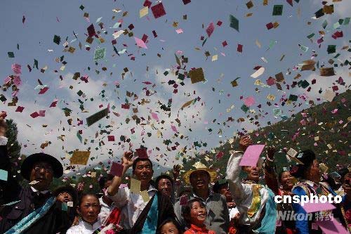 ·圖:藏族群眾拋灑龍達感謝支援者(7月11日 08:33)