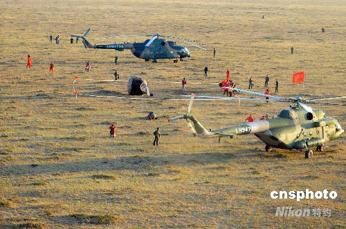 ·圖:搜救隊(duì)員到達(dá)神七返回艙著陸現(xiàn)場(chǎng)(9月29日 19:36)