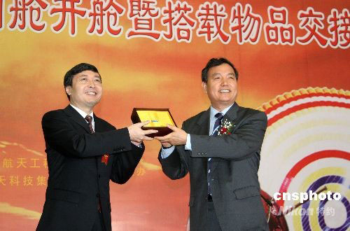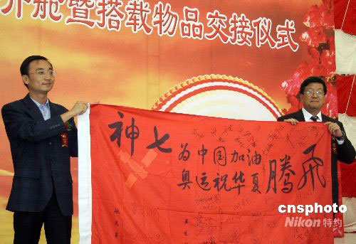 ·圖:“神七”載人飛船總設(shè)計(jì)師張柏楠移交返回艙搭載簽名旗幟(10月1日 17:36)
