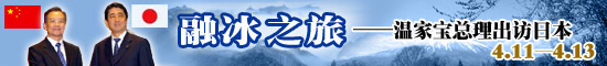 應日本首相安倍晉三邀請,中國總理溫家寶于2007年4月11日至13日對日本進行正式訪問。溫家寶表示,如果說日本首相安倍晉三2006年10月訪問中國是一次“破冰之旅”,那么“我希望我4月份對日本的訪問將成為一次‘融冰之旅’。” [進入專題]