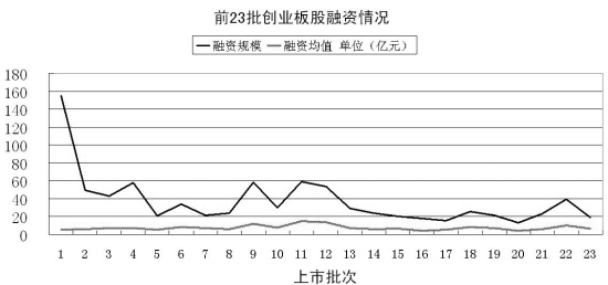 從融資規?矗23批已上市的120只創業板股首發合計融資854.62億元,平均每股首發募資7.12億元。其中,首批28股合計融資154.78億元,居各批次之首;4月30日上市的第11批4股合計融資59.30億元緊隨其后;第9批、第4批及第12批創業板股首發融資額皆在50億元以上;而8月25日上市的第20批3股僅合計融資12.86億元,規模最小。