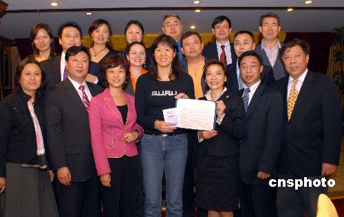 著名中國女排運動員,現任美國女排主教練郎平,十月二十日將赴新澤西州參加美國奧委會的一個頒獎活動,十月十九日郎平取道紐約,受到此間北京鄉親和僑界的熱烈歡迎。紐約州眾議員楊愛倫(前右三)向郎平(前左四)頒發感謝狀,表彰她為中美兩國女排作出的貢獻,并向郎平贈送了她選區(發拉盛)的“護照”。前左三為紐約北京同鄉會會長侯建利。中新社發 龔文謨 攝