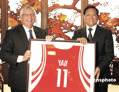正在紐約出席聯合國大會的中共中央政治局委員、北京市委書記、北京奧組委主席劉淇,十一月一日會見美國職業籃球協會(NBA)總裁大衛·斯特恩,斯特恩向劉淇贈送了姚明在NBA火箭隊的十一號球衣。中新社發 李靜 攝