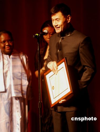 中美電影節十一月一日晚在好萊塢美國導演公會開幕,聯合國兒童機構一個協會特意向中國影星于榮光頒發和平發展親善大使證書。中新社發 賈國榮 攝