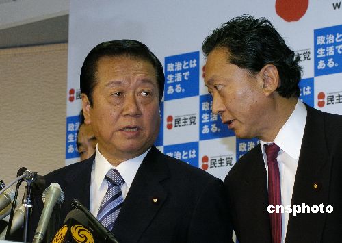 民主黨代表小澤一郎與黨干事長鳩山由紀(jì)夫(右)商討回答記者提問。