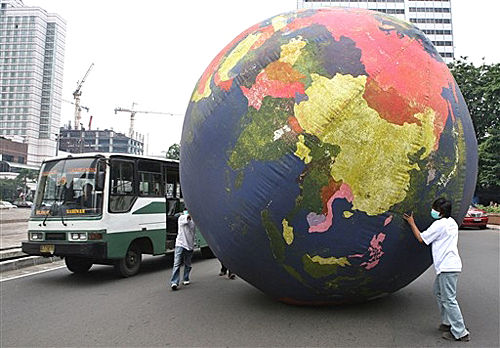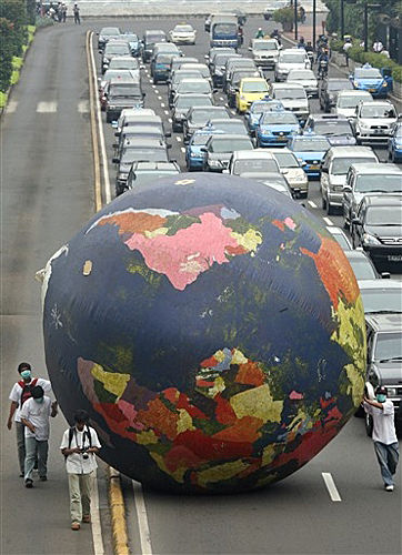 11月16日,印尼的環保主義者在首都雅加達推動一個巨大的充氣地球模型,參加此次“清潔空氣,控制溫度”活動。印尼是全球重要的溫室氣體排放國。今年12月印尼巴厘島將迎來聯合國氣候變化大會。