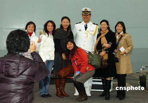 11月28日下午,抵達日本進行正式友好訪問的中國海軍導彈驅逐艦“深圳號”,邀請旅日華僑華人留學生代表與日本民眾上艦參觀,年輕女性參觀者紛紛與英俊帥氣的中國海軍兵哥合影。中新社發 滕劍峰 攝