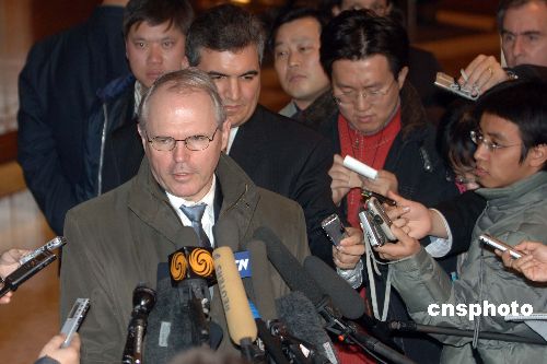 十二月五日,美國助理國務卿希爾結束對朝鮮的訪問抵達北京,在其下榻的酒店接受記者采訪。中新社發 廖攀 攝
