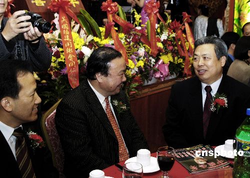 當(dāng)?shù)貢r(shí)間一月八日晚,中國駐紐約總領(lǐng)事館總領(lǐng)事彭克玉大使(右)在紐約曼哈頓華埠美東僑界為他舉辦的歡迎晚宴上與華聯(lián)總會(huì)共同主席梁冠軍(左)和陳清泉(中)親切交談。中新社發(fā) 鄧悅 攝