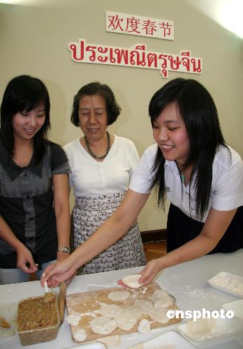 圖為朱拉隆功大學(xué)孔子學(xué)院中方院長、北京大學(xué)教授傅增有(左),在教泰國學(xué)生包餃子。