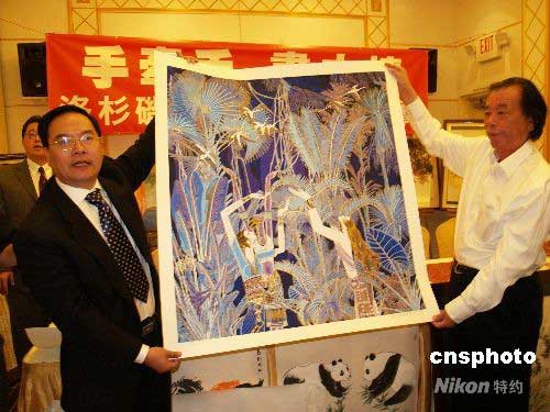 5月27日,著名旅美云南重彩畫家丁紹光捐出自己6幅畫作,參加洛杉磯66位畫家及書法家“手牽手、畫中情”共同為四川大地震捐畫賑災義賣活動。當天,丁紹光的5幅云南重彩畫即被高價拍賣,這次義賣所有款項將交中領館轉四川災區(qū)。圖為丁紹光(右)展示義賣畫作,左為南加州華人團體聯(lián)合總會會長程遠。中新社發(fā) 盧威 攝