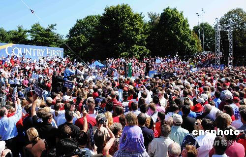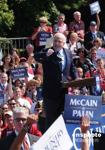 美國(guó)共和黨總統(tǒng)、副總統(tǒng)候選人約翰·麥凱恩和薩拉·佩林10日現(xiàn)身大華盛頓地區(qū)的弗吉尼亞州菲爾法克斯郡為競(jìng)選造勢(shì),支持者高呼“麥凱恩--合眾國(guó)”的口號(hào),手舉麥凱恩、佩林的標(biāo)語(yǔ)牌。中新社發(fā) 邱江波 攝