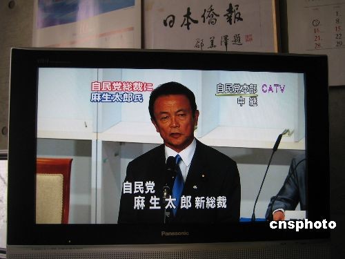 9月22日下午,日本自民黨在東京舉行總裁選舉投票,麻生太郎以351票高票當選第23代日本自民黨總裁。圖為當選新總裁的麻生太郎致詞。其他四位候選人與謝野馨以66票位居第二,小池百合子、石原伸晃和石破茂票數分列后三位。中新社發 段躍中 攝