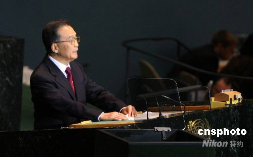 25日,中國總理溫家寶在紐約聯(lián)合國總部舉行的聯(lián)合國千年發(fā)展目標高級別會議上發(fā)表演講,呼吁發(fā)達國家要承擔起幫助不發(fā)達國家的責任。中新社發(fā) 李靜 攝