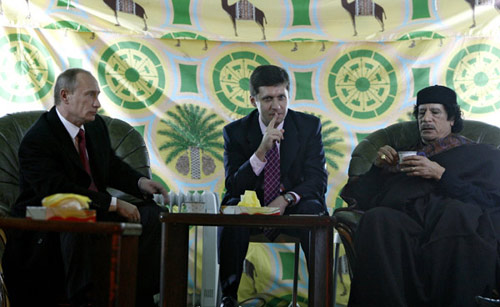 11月1日,俄羅斯總理普京來到利比亞領(lǐng)導(dǎo)人卡扎菲搭建在莫斯科克里姆林宮的貝都因人帳篷內(nèi)會見卡扎菲。
