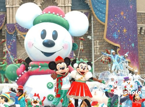 11月7日,東京迪斯尼為迎接2008年圣誕推出了新的卡通形象“雪米奇”。數萬游客從四面八方趕至爭相一睹這個漂亮善良的新朋友。圖為在歌舞表演中的米奇、米妮與雪米奇。中新社發 朱沿華 攝
