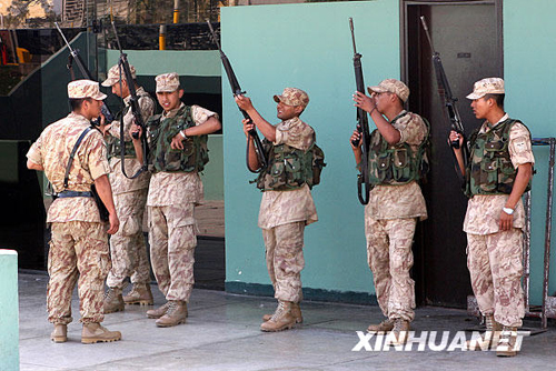 11月16日,在秘魯首都利馬的亞太經合組織(APEC)領導人非正式會議國際新聞中心,執勤士兵檢查槍械。秘魯軍方日前在利馬部署了近一萬名士兵,以確保將于11月22日至23日舉行的APEC第十六次領導人非正式會議安全舉行。