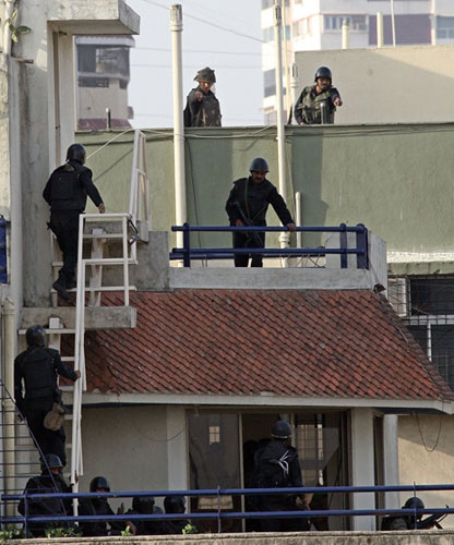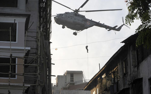 11月28日,在印度孟買,印度突擊隊員從武裝直升機上空降到納里曼大樓的樓頂。印度警方證實,印度軍警已經從孟買市內猶太人聚居的納里曼大樓中解救出7名人質,其中包括2名外國人,但目前還有多名人質在武裝分子手中。