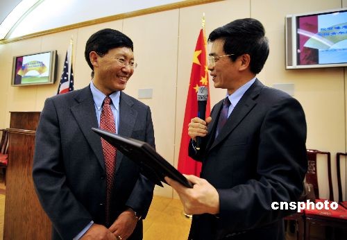 當(dāng)?shù)貢r間十二月五日,中國駐舊金山總領(lǐng)事高占生向美國加州大學(xué)戴維斯分校華裔教授潘忠禮(左)頒發(fā)賀狀,祝賀他獲得2007年度美國青年科學(xué)家總統(tǒng)獎。今年春天,潘忠禮教授曾獲得美國農(nóng)業(yè)部2007年度赫爾伯特-拉波爾特杰出中青年農(nóng)業(yè)研究科學(xué)家獎。中新社發(fā) 陳鋼 攝
