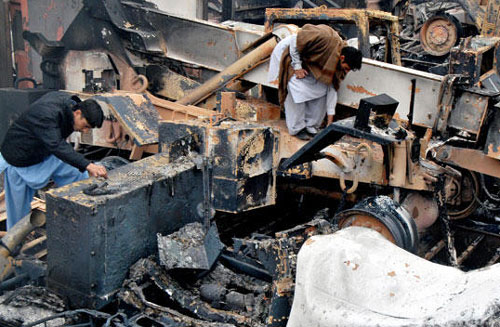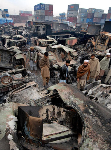 駐阿富汗美軍和北約部隊設(shè)在巴基斯坦境內(nèi)的兩個后勤轉(zhuǎn)運站7日幾乎同時遭武裝分子偷襲,至少有160輛大貨車被炸毀。這是駐阿美軍后勤補給線遭受的最慘痛損失。據(jù)悉,本次襲擊發(fā)生在巴基斯坦西北部邊境城市白沙瓦附近的貨場內(nèi)。
