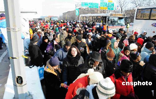 美國東部時間1月20日中午11點30分,美國第44任總統巴拉克·奧巴馬在國會山前宣誓就職。來自全美各地和世界各國的觀禮群眾200多萬人聚集華盛頓國家大草地觀看了這一盛大的就職典禮。由于官方禁止一切非官方車輛出入首都,百萬民眾在等待官方指定擺渡車時,現場如同置身中國春運。中新社發 邱江波 攝