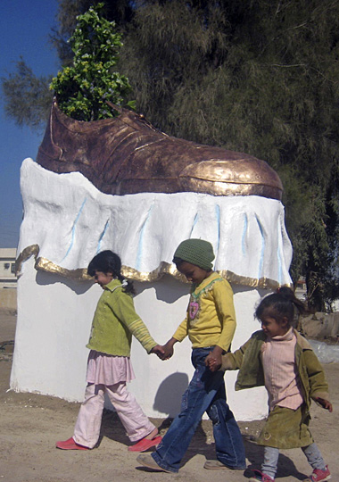 1月30日,伊拉克藝術家創(chuàng)作了這座鞋形雕塑,以對向美國時任總統(tǒng)布什扔鞋的伊拉克記者蒙塔茲·扎伊迪致敬。這座雕像于1月29日正式亮相。