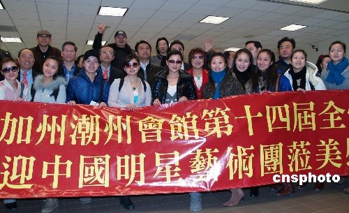 2月7日,江蘇省中國明星藝術(shù)團(tuán)一行34人從美國紐約飛抵洛杉磯,作“心系中華美洲情”巡回慰問演出。他們?cè)跈C(jī)場(chǎng)受到南加州潮洲會(huì)館會(huì)長佘紹漢、副會(huì)長林淦花、監(jiān)事長鄭克成等熱烈歡迎。中新社發(fā) 盧威 攝