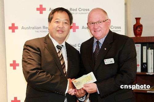 2009年2月19日,西澳福建同鄉(xiāng)會(huì)潘邦照會(huì)長(zhǎng)代表西澳華人向澳大利亞紅十字會(huì)交接澳洲華人社區(qū)為澳大利亞維多利亞火災(zāi)募集的第一筆捐款共四萬七千七百七十七澳幣(折人民幣22萬元)。澳大利亞紅十字會(huì)執(zhí)行理事Steve Joske代表紅十字會(huì)接受捐款并對(duì)澳洲華人們的善舉給予高度贊揚(yáng)。中新社發(fā) 高周丹 攝