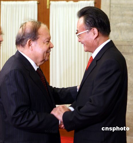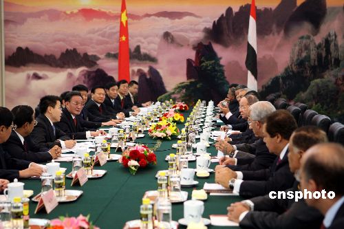 十月二十四日,吳邦國委員長在北京人民大會堂會見由埃及人民議會議長蘇魯爾率領的代表團并主持會談正式啟動雙方交流機制。中新社發 任海霞 攝