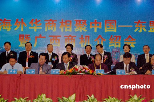 十月二十九日,二〇〇七海外華商相聚中國—東盟博覽會暨廣西商機介紹會在廣西南寧舉行,兩百名華商參加會議,會上簽約十八個項目,金額三點八六億美元。中新社發 劉萬強 攝