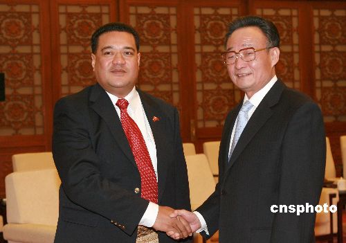 十一月十九日,全國人大常委會委員長吳邦國在北京人民大會堂會見來訪的湯加王國議長圖伊哈安加納。中新社發 廖文靜 攝