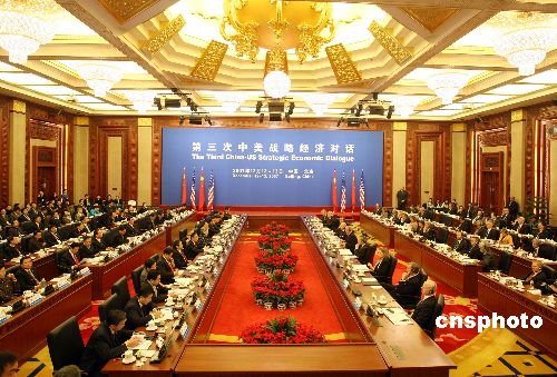 十二月十二日,第三次中美戰略經濟對話在北京中信國安第一城開幕,胡錦濤主席特別代表、國務院副總理吳儀致辭。中新社發 毛建軍 攝