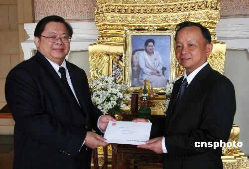 一月三日,中國國家主席胡錦濤向泰國國王普密蓬發來唁電,對泰國王姐甘拉亞妮·瓦塔娜逝世表示哀悼。當日上午,中國駐泰大使張九桓(右)通過泰國外交部轉交這份唁電。中新社發 顧時宏 攝