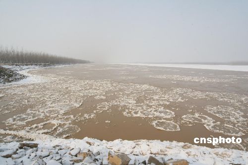 2008年1月20日,黃河下游山東河段,梁山縣高堂以下河段流凌,流凌長度約470公里,流凌密度10—30%,最大70%(河口一號壩)。冰塊面積一般3~10m2,最大面積100 m2(河口一號壩)。局部河段有岸冰。中新社發 俄國慶 攝