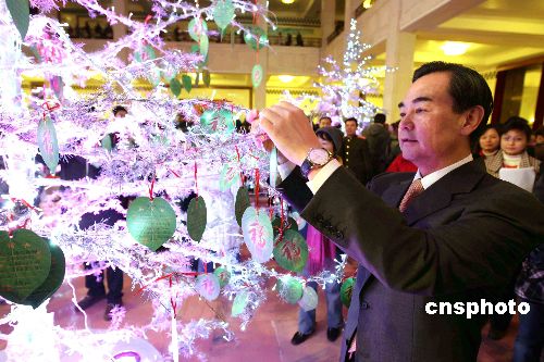 一月二十四日,中國外交部等在北京人民大會堂舉辦慰問駐外外交人員暨親屬春節聯歡會,為他們帶去節日最真誠的祝福。圖為外交部副部長王毅將祝福卡懸掛在祝福樹上。中新社發 任海霞 攝