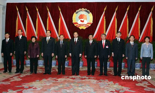 1月28日,政協上海市十一屆一次會議選舉馮國勤(中)為上海市政協主席,朱曉明(右五)、周太彤(左五)、王新奎(右四)、李良園(左四)、錢景林(右三)、吳幼英(左三)、周漢民(右二)、蔡威(左二)、高小玫(右一)為副主席,陳海剛(左一)為秘書長。同日,政協上海市十一屆一次會議閉幕。中新社發 潘索菲 攝