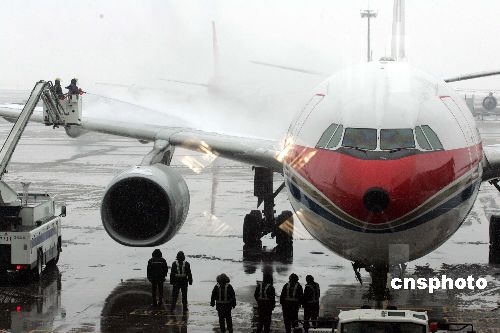 2月2日上午,2008年兩岸春節包機上海航點首個航班——東航MU五00七次航班,冒著數十年未遇的罕見風雪在上海浦東機場順利起飛。這架航班滿載著近三百位臺胞乘客直飛臺北。中新社發 潘索菲 攝