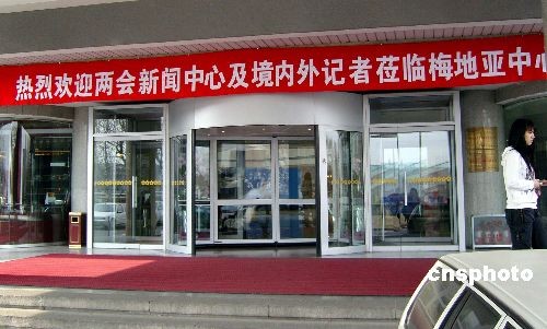 圖為“兩會”新聞中心所在地梅地亞賓館入口掛起了歡迎橫幅。