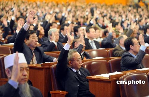 圖:委員表決全國政協十一屆一次會議議程等事項