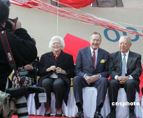 三月十一日,香港董氏集團下屬東方海外貨柜航運有限公司的新船——“東方德州號”集裝箱船命名儀式在上海洋山深水港舉行。圖為美國前總統喬治·布什夫婦和全國政協副主席董建華等出席命名儀式,并合影留念。中新社發 高爾強 攝