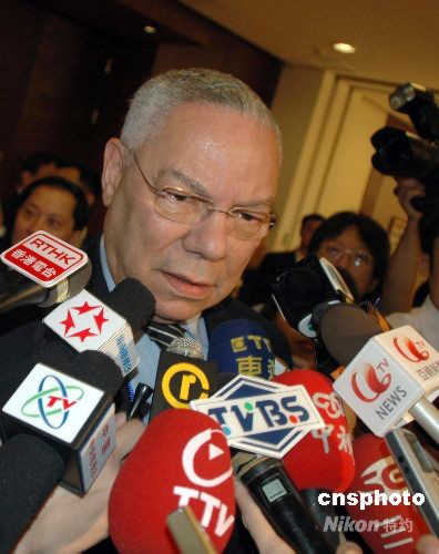 2008年4月12日,博鰲亞洲論壇開幕。圖為美國前國務卿鮑威爾在當日出席論壇會議后,被幾十名與會媒體記者圍堵提問。中新社發 王辛莉 攝