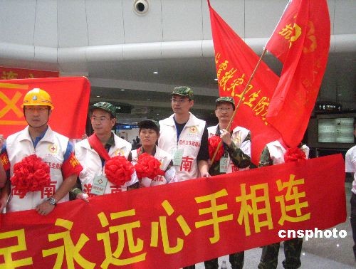 五月二十日,首批海南青年醫療衛生抗震救災志愿者服務隊共二十五人,從?诿捞m機場出發,前往四川綿陽平武縣抗震救災。該批具有專業醫療技能及抗震經驗的志愿者,來自海南省人民醫院、海南省及各市縣疾控中心,由海南省衛生廳及共青團海南省委共同招募。