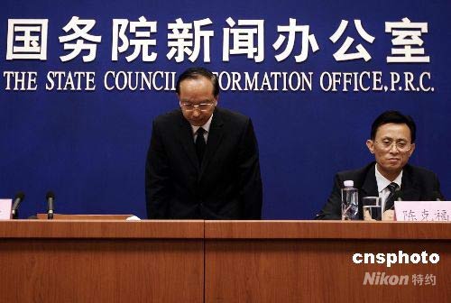 5月23日,在國務院新聞辦公室就四川汶川地震災害和抗震救災情況舉行的第十二次發布會上,四川省副省長李成云鞠躬感謝全國人民的支持。中新社發 杜洋 攝