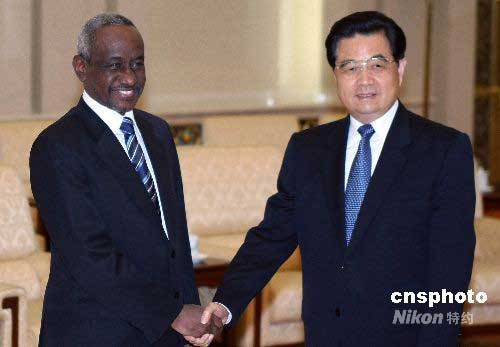中國國家主席胡錦濤,6月11日在北京人民大會堂會見蘇丹共和國副總統阿里·奧斯曼·穆罕默德·塔哈。阿里·奧斯曼·穆罕默德·塔哈副總統是應中國國家副主席習近平的邀請,于6月9日至15日對中國進行正式訪問。中新社發 任晨鳴 攝