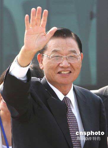 十一日下午三時十五分許,臺灣海峽交流基金會董事長江丙坤率;鶗韴F抵達北京首都機場,向在場的中外媒體揮手致意。中新社發 趙振清 攝