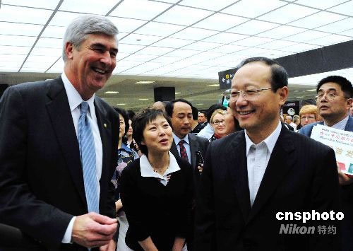 當(dāng)?shù)貢r間6月17日晚,中國公民赴美旅游首發(fā)團(tuán)抵達(dá)華盛頓杜勒斯國際機(jī)場,中國國家旅游局局長邵琪偉在隨北京團(tuán)抵達(dá)后對記者表示,中美兩國在旅游方面有了很好的旅游機(jī)制,首發(fā)團(tuán)到達(dá)美國,標(biāo)志著中美兩國團(tuán)隊(duì)旅游開始全面啟動。這將對今后中美之間政治、經(jīng)濟(jì)、文化等方面的合作起到積極的推動作用。圖為邵琪偉受到美國商務(wù)部助理部長威廉姆斯·薩頓等熱烈歡迎。中新社發(fā) 邱江波 攝