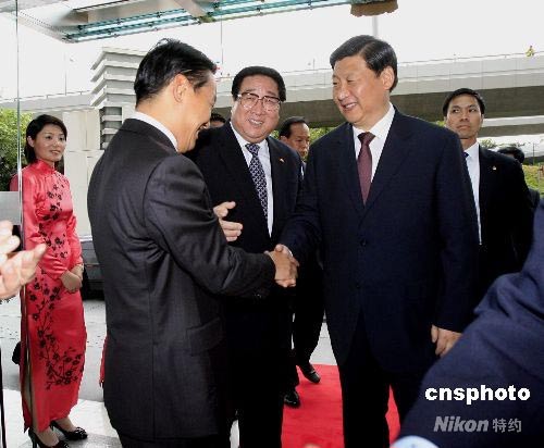 七月七日,中國國家副主席習近平(右)在中央駐港聯絡辦公室接見中央駐港機構和中資機構負責人,中聯辦主任高祀仁(中)及多位副主任到門口迎接。中新社發 王麗南 攝