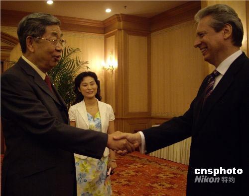 7月8日晚,當(dāng)羅馬尼亞駐華大使伊斯蒂奇瓦亞(右)用一口流利的中文與十屆全國(guó)人大常委會(huì)副委員長(zhǎng)許嘉璐(左)進(jìn)行著一次關(guān)于全球化背景下語(yǔ)言作用的深刻對(duì)話時(shí),漢語(yǔ)無(wú)疑搭建了一座溝通中國(guó)與世界心靈與思想的橋梁。 包括伊斯蒂奇瓦亞及秘魯、保加利亞、孟加拉、印尼等國(guó)的駐華使節(jié),隨55個(gè)國(guó)家的100多名大學(xué)生漢語(yǔ)愛(ài)好者一道來(lái)到湖南長(zhǎng)沙,這些學(xué)生將參加第七屆“漢語(yǔ)橋”世界大學(xué)生中文比賽。當(dāng)晚,許嘉璐在長(zhǎng)沙會(huì)見(jiàn)了駐華使節(jié)一行。中新社發(fā) 傅煜 攝